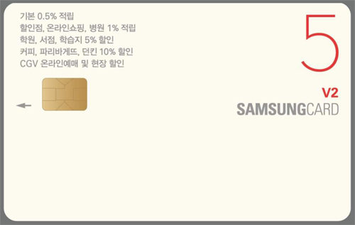 삼성카드 관계자는 “가족과 자녀 중심의 소비를 하는 회원들을 대상으로 쇼핑 및 교육업종에서 다양한 혜택을 제공하는 삼성카드 5 V2를 기획했다”며 “고객의 생활에 꼭 필요한 서비스를 제공하는 다양한 숫자카드를 선보일 계획”이라고 말했다.