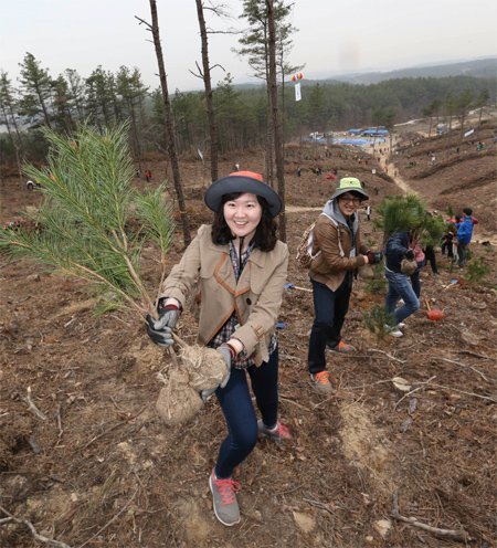 유한킴벌리는 29일 경기 여주시 강천면 걸은리 일대 야산에서 신혼부부와 사회지도층, 유한킴벌리 임직원 등 800여 명이 참석한 가운데 ‘2014 신혼부부 나무심기’ 행사를 열었다. 유한킴벌리의 ‘우리강산 푸르게 푸르게’ 캠페인의 일환으로 진행되는 이 행사는 올해로 30년째를 맞았다.