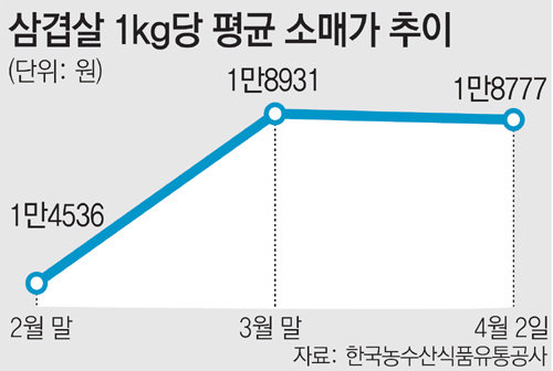 3일 한국농수산식품공사에 따르면 삼겹살 1kg의 평균 소매가격은 2월 28일 1만4536원에서 이달 2일 1만8777원으로 29.2% 올랐다. 이는 1년 전 가격인 1만3264원에 비해서도 41.6% 오른 수치다.