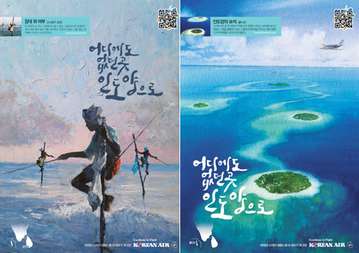 ‘어디에도 없던 곳 인도양으로’는 2013년 3월부터 운항을 개시한 인도양의 아름다운 두 개의 섬나라, 스리랑카(사진 왼쪽)와 몰디브(오른쪽)를 모티브로 제작됐다. ‘인도양의 진주’, ‘인도양의 보석’으로 불리며 천혜의 자연과 다양한 관광자원을 숨기고 있는 스리랑카는 생생한 터치감이 느껴지는 유화 형식으로 제작됐다.