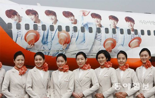 제주항공은 7일 서울 강서구 하늘길 김포공항에서 자사 홍보모델인 배우 이민호 씨의 모습을 래핑한 여객기 B737을 공개했다. 여객기 앞에 서 있는 승무원들은 신입 승무원들이다.