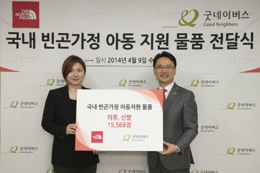 노스페이스(대표 성기학)가 국제구호개발 NGO 굿네이버스(회장 이일하)와 ‘국내 저소득층 지원 물품 전달식’을 9일 진행했다.
