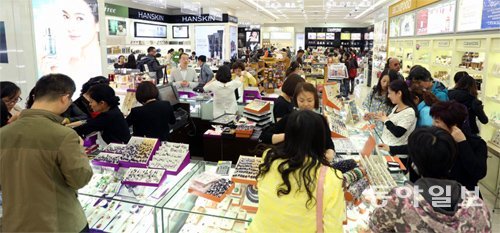9일 서울 종로구 세종로 동화면세점을 찾은 중국인 관광객들이 쇼핑을 즐기고 있다. 면세점 및 백화점 업계는 이달 30일 시작되는 중국 노동절에 맞춰 관광객이 대거 방한할 것으로 보고 다양한 이벤트를 준비하고 있다. 신원건 기자 laputa@donga.com