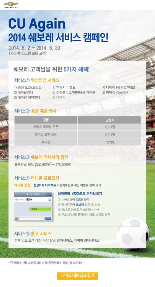 이번에 실시되는 서비스 캠페인은 ▲엔진오일 세트, 에어컨 작동상태, 에어컨 에어필터, 팬 벨트, 점화플러그/케이블, 냉각수, 타이어 등 7개 항목 무상점검 ▲서비스 할인 모바일 쿠폰(2만원권) 2,014장 증정 ▲차량 실내 냄새 제거제, 김서림 방지제 등 케미컬 용품 교환쿠폰 2,014장 증정 ▲축구공 777개 증정 ▲무상 살균 탈취 및 타이어 광택 서비스 ▲차량용 블랙박스 30% 특별 할인판매 등의 항목으로 구성된다.