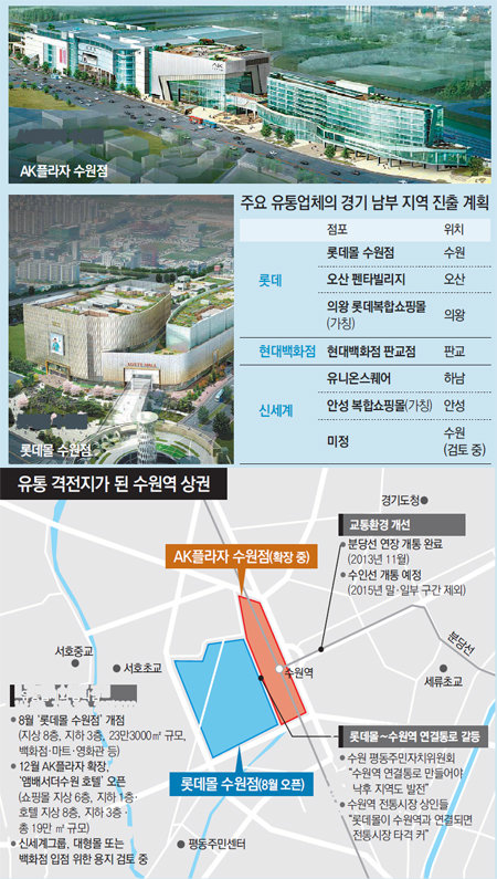 롯데와 신세계, 애경그룹이 경기 남부의 대표적인 상권인 수원역(지하철 1호선·경기 수원시 권선구) 일대에서 주도권을 차지하기 위해 각축전을 벌이고 있다. 롯데와 애경은 수원역과 롯데 매장을 연결하는 지하통로 개설을 놓고 치열한 신경전까지 벌이고 있다.