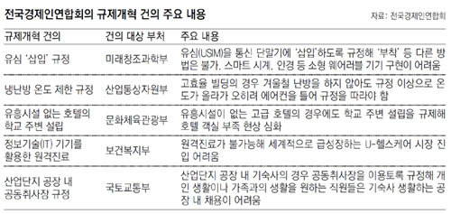 건의안에 따르면 기업들은 빠르게 변화하는 기술 시대에 뒤떨어지거나 합리적 근거를 찾기 힘든 여러 규제에 대한 개선을 요구하고 있었다.