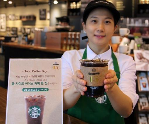 스타벅스커피 코리아(대표 이석구)가 개점 15주년을 맞아 25일 오후 3시부터 4시까지 전국 62개 도시 670여 매장에서 아이스커피를 무료로 제공하는 ‘굿 커피 데이’ 행사를 진행했다.