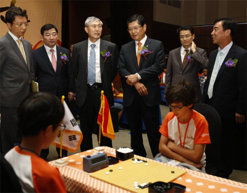 7일 서울 영등포구 63빌딩 그랜드볼룸에서는 ‘제14회 한화생명배 세계 어린이 국수전’ 결선이 열려 9개국에서 온 어린이 272명이 뜨거운 경쟁을 펼쳤다. 한국과 스페인 어린이의 대국을 차남규 한화생명 대표(왼쪽에서 네 번째), 조훈현 국수(왼쪽에서 세 번째) 등이 지켜보고 있다.