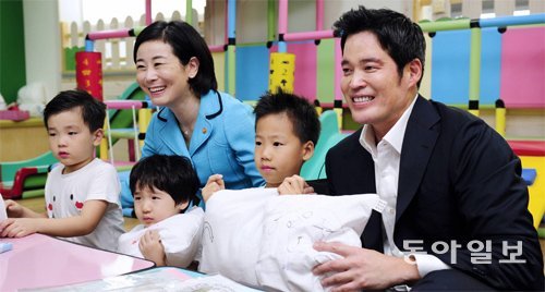 지난해 쌍둥이 아빠가 된 정용진 신세계그룹 부회장(사진 오른쪽)이 28일 세종시에 ‘신세계이마트 공동육아나눔터’ 1호를 개설했다.