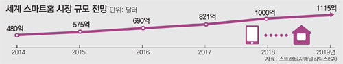 스마트홈은 집안의 설비, 기기들이 사물인터넷(IoT)으로 연결돼 스스로 정보를 주고받거나 원격으로 관리할 수 있는 환경을 말한다. 미국 시장조사업체 스트래티지애널리틱스(SA)에 따르면 스마트홈 시장은 올해 480억 달러(약 49조 원)에서 2019년에는 1115억 달러(약 114조 원)로 폭발적 성장세를 보일 것으로 전망된다. 하지만 현재까지는 주로 가전업체의 영역으로만 인식돼 왔다. 이달 초 독일 베를린에서 열린 가전전시회(IFA)에서는 삼성전자 LG전자 등 가전업체들이 스마트홈 가전제품을 내놓고 ‘미래형 가정’의 모습을 그려내기도 했다.