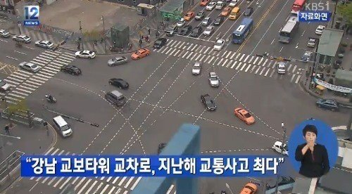 23일 국회 안전행정위원회 소속 새누리당 강기윤 의원이 도로교통공단으로부터 제출받은 자료에 따르면 강남구 논현동 교보타워교차로에서는 지난해 사고 60건이 발생했다.