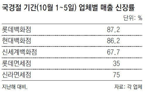 중국 국경절 기간(10월 1∼7일)을 맞아 한국을 방문한 유커(遊客·중국인 관광객) 덕분에 국내 백화점과 면세점의 매출이 크게 올랐다. 1∼5일 주요 백화점의 중국인 관광객 매출은 지난해보다 최대 87%까지 증가하며 큰 상승세를 보였다.
