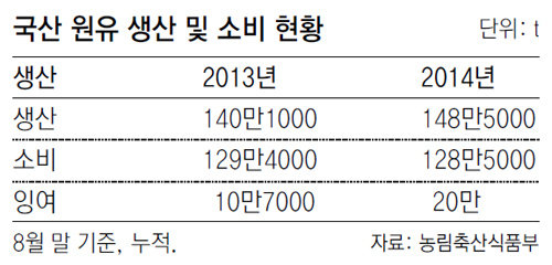 농식품부에 따르면 올해 1∼8월 원유(原乳·젖소에서 갓 짜낸 우유) 소비량은 128만5000t으로 전년 동기(129만4000t) 대비 0.7% 감소했다. 이 기간 원유 생산량은 148만5000t으로 지난해 같은 기간(140만1000t)보다 6.0%나 늘었다. 이에 따라 남는 원유량은 20만 t으로 전년 동기(10만7000t)의 두 배에 육박(86.9%)하게 됐다. 유가공업체는 남는 원유를 분유 형태로 말려 보관하고 있는데, 이런 분유 재고량이 올해 7월 현재 1만4896t으로 2003년 3월(1만716t)년 이후 11년 만에 최고치를 나타냈다.