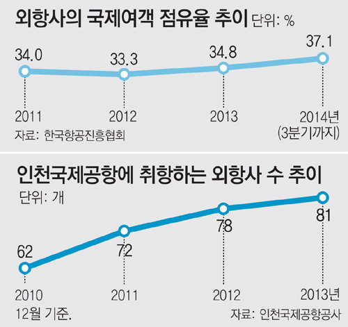 국토교통부에 따르면 외국 항공사들의 국제여객 노선의 점유율이 2012년부터 꾸준히 높아지고 있다. 올해 1월 34.5%였던 점유율은 매달 높아지더니 항공업계 최대 성수기인 8월에는 39.3%까지 올랐다. 인천국제공항에 취항하는 외국 항공사도 2010년 62곳에서 지난해 81곳으로 늘었다.