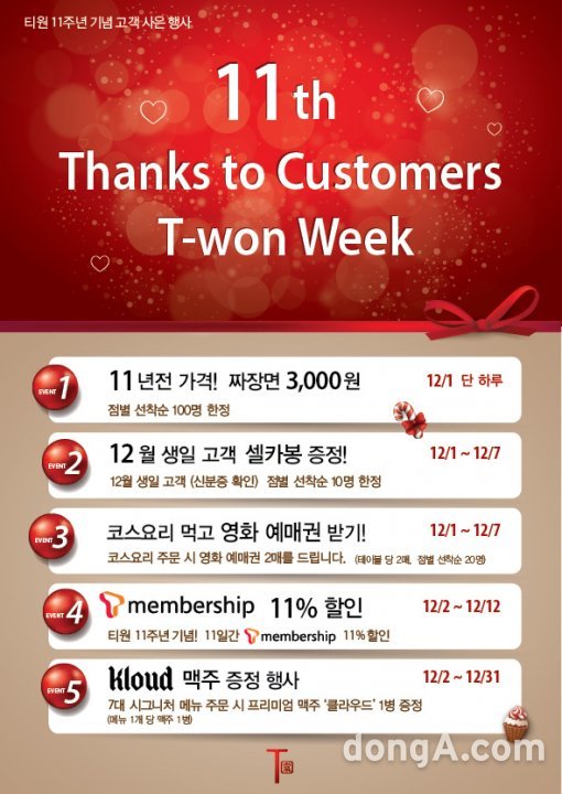 다이닝 티원은 브랜드 탄생을 기념해 11년 전 가격 3000원 자장면, 12월 생일 고객 대상 선물제공, 코스요리 주문 시 영화예매권 2매 등을 선착순으로 제공하고, 11주년 기념 11일간 T멤버십 11%할인 등을 제공한다. 또한 7대 시그니처 메뉴 주문 시 클라우드 맥주 1병 증정, 한화데이즈 SNS 행사도 준비했다.