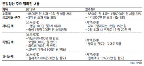 소득세 세율 조정도 고소득 직장인에게는 불리하게 작용할 것으로 전망된다. 종전에는 연간 총 소득에서 각종 공제를 뺀 과세표준 3억 원 초과 소득에 대해 최고세율인 38%가 적용됐지만 올해부터는 1억5000만 원 초과 소득부터 38%의 세율이 적용된다. 이에 따라 지금까지는 8800만 원 초과 3억 원까지는 모두 35%의 소득세율을 적용받았지만 올해는 8800만 원 초과∼1억5000만 원 이하는 35%, 1억5000만 원 초과 소득은 38%의 세율을 적용받는다.