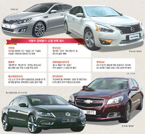 12월은 자동차 업계의 판촉행사가 쏟아지는 달이다. 자동차 회사들이 연간 판매목표를 달성하기 위해 각종 혜택을 쏟아내는 데다 연식변경 모델과 신차를 내놓기에 앞서 곧 ‘구형’이 될 모델을 싸게 내놓기 때문이다. 일부 업체는 경쟁사들에 밀리지 않기 위해 색다른 판촉으로 맞불을 놓기도 한다. 신차만을 고집하지 않겠다고 마음먹었다면 이번 기회에 업체별 판촉 행사를 꼼꼼하게 비교해 보자.