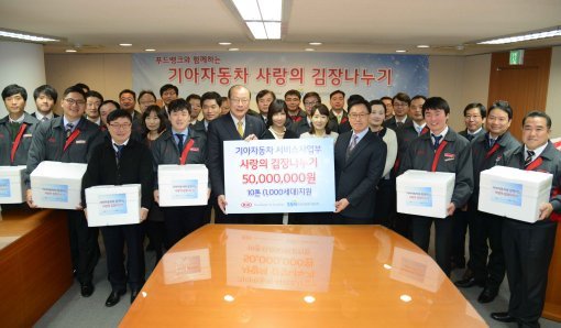 이와 함께 같은 날 기아차는 서울시 구로구 소재 기아자동차 서비스사업부 사옥에서 한국사회복지협의회 차흥봉 회장, 기아차 홍근선 서비스사업부장 등 행사 관계자 50여명이 참석한 가운데 ‘사랑의 김장김치 지원’ 전달식을 가졌다.