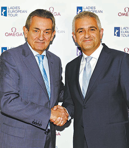 이달 초 10년 장기 후원 계약을 맺은 스티븐 어쿼트 오메가 회장(왼쪽)과 이반 코다바크시 유럽여자프로골프투어(LET) 최고경영자(CEO). 오메가 제공