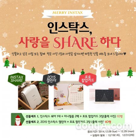 추첨을 통해 총 50명에게 인스탁스 선물세트 2가지 버전을 제공할 예정이다. ‘인스탁스 선물세트1’은 포토프린터 인스탁스 쉐어 1대와 미니필름 20장, 포토팝업카드 3매가 담겼으며, 총 10명에게 증정한다. 당첨된 40명에게는 2015년 후지필름 인스탁스 캘린더와 포토팝업카드 3매가 담긴 ‘인스탁스 선물세트 2’가 선물로 전달된다.