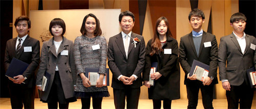 포니정재단은 24일 서울 강남구 포니정홀에서 ‘2015 장학증서 및 학술지원증서 수여식’을 열고 국내 대학생 30명과 인문학 분야 박사 연구자 2명, 한국에 유학 중인 베트남 출신 대학원생 1명에게 각각 장학금 및 연구비를 수여했다. 이날 정몽규 현대산업개발 회장(왼쪽에서 네 번째)은 장학증서를 수여한 뒤 장학생들과 기념 촬영을 했다.