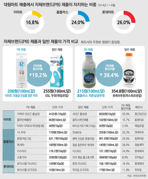 이처럼 PB 제품 가격이 더 저렴해지자 PB 제품을 구매하는 소비자도 크게 늘고 있다. 올해 6월 말을 기준으로 대형마트 매출액 중 PB 제품의 비중은 이마트가 16.8%, 홈플러스가 24.0%, 롯데마트가 26.0%에 이른다.