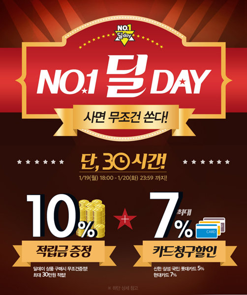 ‘넘버원 딜데이’ 이벤트에서는 특가 상품, 사은품 증정, 무이자 할부 혜택 등을 역대 최대로 준비한 27개의 ‘넘버원 딜’ 상품을 선보인다. 이들 상품은 왼쪽 상단에 ‘NO.1딜day’ 표시로 구분된다. ‘넘버원 딜’ 상품을 구입하면 구입한 금액의 10%가 그대로 적립되며 최대 30만원까지 적립금이 쌓인다. 또 5만원 이상 신용카드로 결제 시 신한·삼성·국민·롯데카드는 5%, 현대카드는 7%가 청구 할인된다.