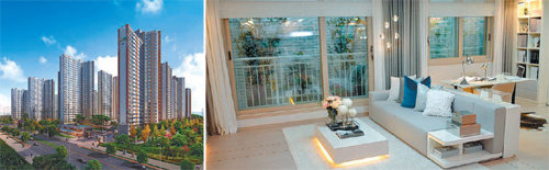 경기 시흥시 배곧신도시에 지어질 ‘시흥 배곧신도시 호반베르디움 3차’조감도(왼쪽). 오른쪽은 65㎡ A타입 거실. 판상형 구조로 통풍과 환기가 잘된다. 호반건설 제공