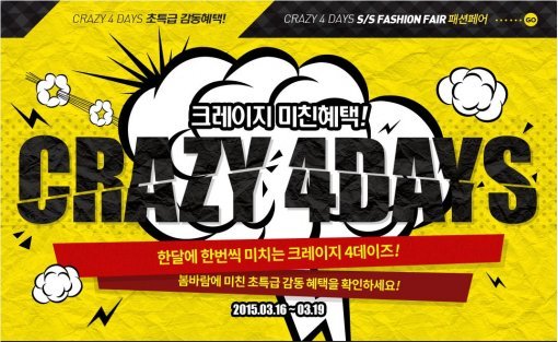 ‘크레이지 4데이즈’ 기간 동안 모바일 앱 전용 15% 할인쿠폰과 백화점관 전용 20% 할인쿠폰을 제공하며, ‘매일 출석 이벤트’를 통해 150명에게 적립금 1000원을 지급한다. KB국민카드로 결제하면 7% 청구할인(15만원 이상 결제시) 혜택과 카드전용 10% 할인쿠폰, 카드전용 7% 중복쿠폰 등 최고 24%까지 할인 혜택을 제공한다.