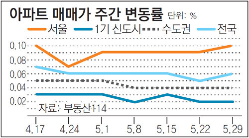 5월 서울 아파트 값은 한 달간 0.47% 올라 전달(0.38%)에 비해 오히려 오름폭이 커졌다. 전세난이 해소되지 못한 채 매매로 갈아타는 수요가 꾸준히 유입되면서 아파트 가격을 밀어 올린 것으로 풀이된다.