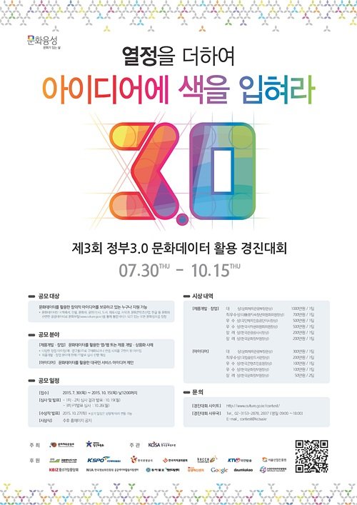 7월 30일부터 10월 15일까지 ‘열정을 더하여 아이디어에 색을 입혀라 3.0’을 주제로 진행되는 이번 경진대회는 문화체육관광부와 대통령직속 청년위원회가 주최하고, 한국문화정보원이 주관으로 이뤄지며, 문화데이터를 활용한 앱/웹 또는 제품개발ㆍ상품화 사례로 나뉘며, 제품개발과 창업분야에 한해서는 PT발표 심사도 진행한다.