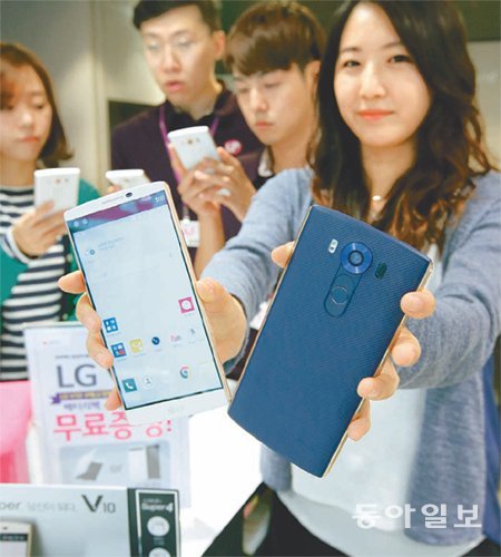 8일부터 국내 판매가 시작된 LG전자 전략 스마트폰 ‘LG V10’을 LG유플러스 직원이 들어 보이고 있다. 출고가 79만9700원인 LG V10의 최대 공시지원금은 28만5000원이다. 추가 지원금 15%(4만2750원)를 더하면 47만 원대에 살 수 있다. 이날 최대 요금제(10만 원대) 기준 SK텔레콤은 23만9000원, KT는 28만1000원, LG유플러스는 28만5000원의 지원금을 공시했다.