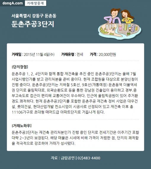 서울특별시 강동구 둔촌동에 위치한 둔촌주공3단지 아파트는 1980년 12월 입주한 최고 10층, 총 25개동, 1480세대 규모이다. 국토교통부 실거래 자료를 기준으로, 가장 최근 거래 건은 지난 2015년 8월에 신고 된 4층 전세가 2억7000만 원이다. 2015년 평균 전세 실거래가는 2억7583만 원이며, 거래량은 42건 이다.