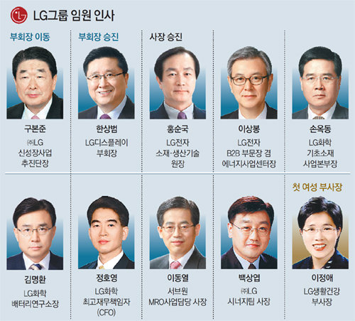 애초 실적 부진으로 사장단 승진 폭은 작을 것이라는 전망이 많았지만 LG는 이날 부회장 1명, 사장 7명 등 모두 8명의 사장단 승진 인사를 실시했다. 지난해는 사장단 승진자가 3명에 불과했다. LG 측은 “저성장과 글로벌 경쟁이 심화되는 어려운 경영환경을 돌파하기 위해 대폭의 혁신 인사를 단행했다”고 설명했다. 다만 전체 임원 승진자는 지난해(130명)보다 줄어들 것으로 알려졌다.