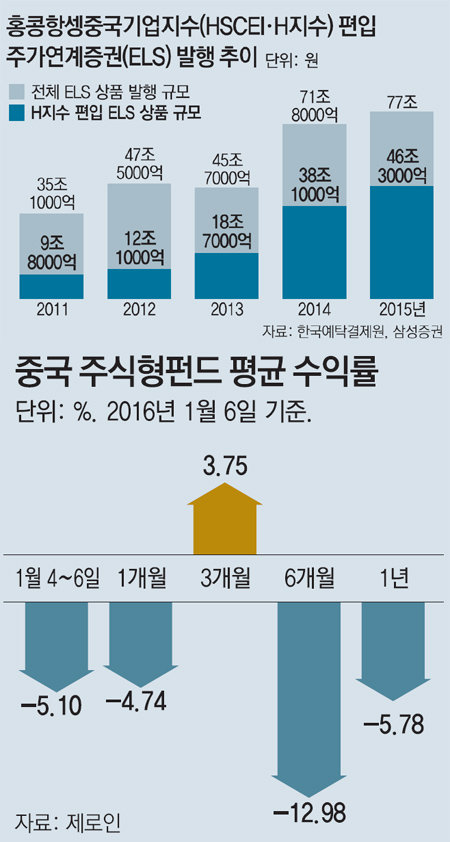 중국 증시 폭락의 후폭풍은 주가연계증권(ELS)에도 악영향을 미치고 있다. 국내 증권사가 주로 기초지수로 활용하는 홍콩항셍중국기업지수(HSCEI·H지수)는 올해에만 8.44% 하락하며 8,845.89까지 떨어졌다. 금융정보업체 에프앤가이드에 따르면 이날까지 H지수 하락으로 원금 손실(녹인·Knock-In) 구간에 진입한 상품은 11개로 잔액은 168억 원 수준이다. H지수를 기초로 한 ELS 잔액 90%의 원금 손실 구간이 4,500∼7,850에 몰려 있어 중국 증시가 계속 하락하면 ELS 대량 손실은 불가피해 보인다.