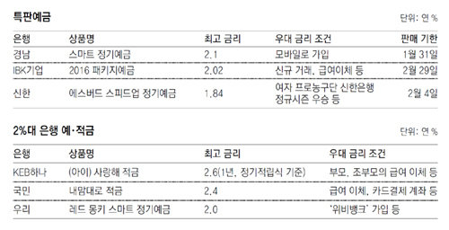 은행들이 새해를 맞아 속속 내놓고 있는 특판 예금이나 신규 예·적금 상품은 이 씨와 같은 고민을 하고 있는 이들에겐 좋은 선택지 중 하나다. 최근에는 저금리 시대에 찾기 힘들었던 연 2%대 금리를 주는 상품도 등장하고 있다.