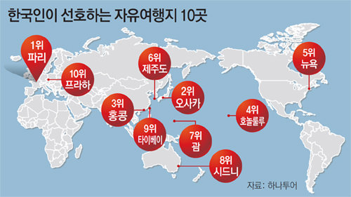 하나투어는 지난해 12월 자사 홈페이지 방문객 7200명을 대상으로 ‘자유여행으로 가보고 싶은 도시’를 설문조사한 결과 프랑스 파리(9%)가 1위로 나타났다고 18일 밝혔다. 하나투어 관계자는 “여행사 패키지로 파리를 이미 다녀온 관광객 중에서 ‘자유롭게 다시 한번 둘러보고 싶다’는 의견이 많았다”고 전했다. 또 ‘낭만’의 도시답게 커플 여행객의 선호도가 높은 여행지로 확인됐다. 2, 3위는 각각 아시아권인 일본 오사카(大阪·7.4%)와 홍콩(7.2%)으로 집계됐다. 일본과 중국을 대표하는 도시인 도쿄(東京)와 베이징(北京)은 순위권에 들지 못했다. 하나투어 측은 “자유여행을 선택하는 관광객들은 여러 도시를 둘러본 만큼 도쿄나 베이징 등은 많이 방문했을 가능성이 크다”며 “오사카와 홍콩은 최근 다양한 먹을거리를 맛보고 싶어 하는 여행객들이 즐겨 찾는 장소”라고 설명했다.