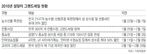 전국 221개 직거래장터와 공영 TV홈쇼핑, 인터넷 수협쇼핑 등 인터넷쇼핑몰도 할인 행사에 동참한다. 정부는 설 소비 분위기를 이어가기 위해 ‘한국 방문의 해’를 기념해 외국인 관광객을 대상으로 백화점과 면세점 등이 참여하는 ‘코리아 그랜드세일’ 행사를 다음 달 1일부터 한 달 동안 열 계획이다.