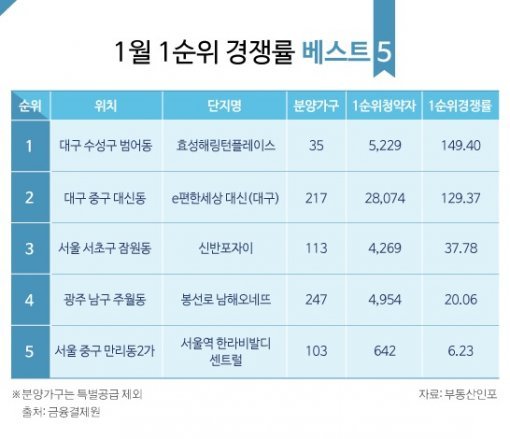 한편 1월 분양한 5578가구(임대제외)중 일반분양(특별공급 제외)물량은 5190가구로 1순위에만 총 5만1169명이 청약, 1순위 평균 경쟁률이 9.86대 1로 나타났다. 1순위 마감단지는 총 12곳이다.