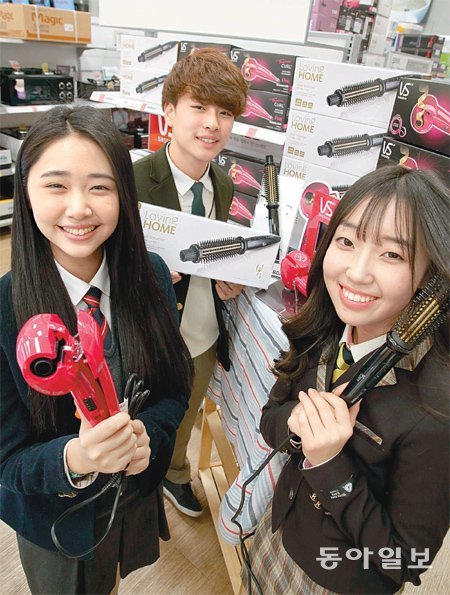 이마트는 새 학기를 앞두고 중고교생용 ‘고데기’(전기머리인두)를 할인 판매한다고 21일 밝혔다. 서울 중구 청계천로 이마트 청계천점에서 학생 모델들이 선보인 ‘러빙홈 고데기’와 ‘비달사순 패션컬’ 제품은 각각 2만4800원, 6만9800원이다.