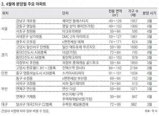 3, 4월에도 건설사들은 핵심 지역에서 분양 물량을 내놓을 계획이다. 서울은 재건축 지역, 경기와 인천 등 수도권은 택지지구를 중심으로 분양 물량이 나온다. 서울에서는 삼성물산이 강동구 명일동 삼성그린맨션을 재건축한 ‘명일 삼익 래미안’(가칭)을 4월 분양할 계획이다. 이 아파트는 전용면적 49∼103m² 1900채로 구성된다. 이 중 268채가 일반 분양된다. 서울 지하철 5호선 명일역이 이 단지에서 걸어서 5분 거리에 있다. 고명초, 명일초·중, 한영중, 배재중·고, 한영고, 한영외고, 명일여고 등이 주변에 있다.