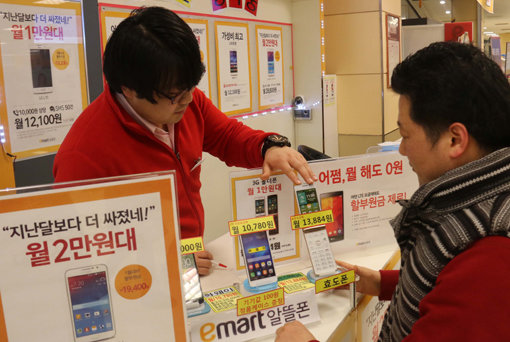 이마트 알뜰폰이 LG유플러스망 사용 고객을 대상으로 해외 무제한 데이터로밍 서비스를 내놨다. 한 소비자가 이마트 알뜰폰 가입 상담을 받고 있다. 사진제공|이마트