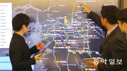 한국마이크로소프트(MS)는 4일 서울 종로구 본사에 국내외 해킹을 탐지할 수 있는 사이버보안센터를 설립했다. 한국MS 직원들이 사이버안보센터 내에서 지도를 보며 악성코드의 분포도를 확인하고 있다.