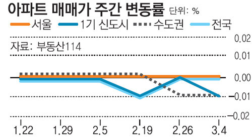 6일 부동산114에 따르면 지난주 서울 아파트 매매가격은 10주째 변동이 없었다. 성북(0.08%) 강서(0.05%) 마포구(0.04%) 등이 전주보다 매매가격이 오른 반면 송파(―0.12%) 강동(―0.01%) 금천구(―0.01%)는 하락했다. 서울 재건축 아파트 값은 0.03% 내려 전주(―0.06%)보다 하락폭이 소폭 줄었다.