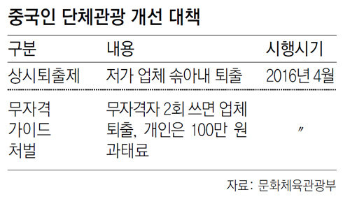 앞으로 값싼 여행비를 미끼로 중국인 관광객(遊客·유커)을 유치한 뒤 이를 벌충하기 위해 쇼핑 등을 강요하다가 적발되는 여행사는 업계에서 퇴출된다. 또 자격을 갖추지 못한 중국어 가이드를 쓸 경우 해당 업체와 가이드 모두 처벌을 받는다.