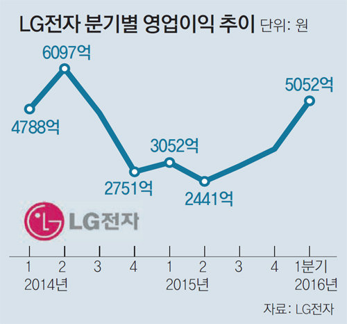 LG전자 영업이익이 5000억 원대로 재진입한 것은 2014년 2분기(6097억 원) 이후 7개 분기 만이다. 최근 2년 동안 스마트폰 성적 부진 및 TV, 백색가전제품 업계의 경쟁 심화로 LG전자의 분기별 영업이익은 2000억∼3000억 원대 중반 수준에 머물렀다.