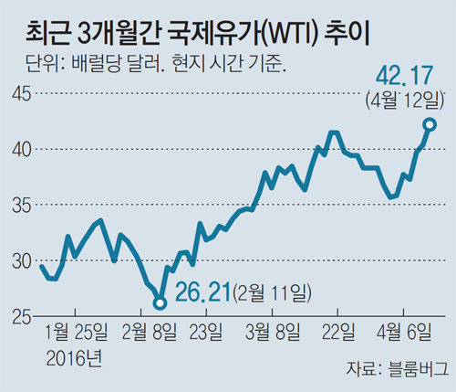 12일(현지 시간) 뉴욕상업거래소에서 5월 인도분 서부텍사스산원유(WTI)는 전날보다 4.48% 오른 배럴당 42.17달러에 거래를 마쳤다. 지난해 11월 말 이후 최고치로 올해 최저점(2월 11일)보다 61%가량 올랐다. 북해산 브렌트유(배럴당 44.69달러)와 두바이유(배럴당 39.03달러)도 연중 최고치로 마감했다. 이날 글로벌 증시도 유가 상승으로 에너지 업종이 강세를 보이며 줄줄이 올랐다. 이날 국제유가의 움직임은 ‘러시아와 사우디아라비아가 17일 열릴 카타르 도하 회의에서 산유량을 동결하기로 뜻을 모았다’는 러시아 인테르팍스통신 보도가 나온 게 영향을 미쳤다.