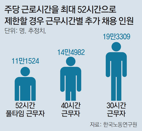 한국노동연구원에 따르면 2014년 기준으로 국내 전체 근로자 1010만5500명 중 주당 52시간을 초과해 일하는 근로자는 모두 105만4700명(10.4%)이었다. 노동연구원은 주당 근로시간 한도를 52시간으로 낮출 경우 주당 52시간 일하는 풀타임 근로자를 11만1524명 더 채용할 수 있을 것으로 추정했다. 또 대체인력을 주당 30시간 일하는 근로자들로만 구하면 총 19만3309개의 신규 일자리가 생길 것으로 내다봤다.