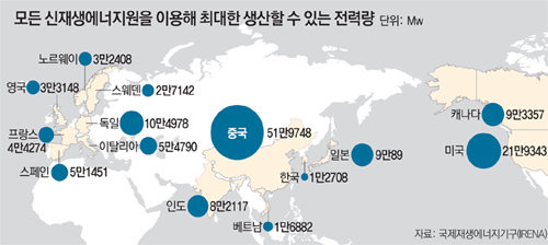 각국이 이처럼 바이오에너지 등을 이용해 신성장산업에 적극 투자하고 있지만 한국의 발걸음은 유난히 더딘 편이다. 국제재생에너지기구(IRENA)가 올해 발표한 보고서에 따르면 한국이 신재생에너지원을 이용해 최대한 생산해낼 수 있는 전력량은 1만2708MW로 중국(51만9748MW)의 2.45%에 불과했다. 일본(9만89MW) 인도(8만2117MW)는 물론이고 개도국인 베트남(1만6882MW)보다도 낮은 수준이다. 에너지 관련 국책연구원의 한 실장급 연구위원은 “앞으로 바이오연료 사용을 늘려야 한다는 것은 일반인들도 누구나 갖고 있는 생각이지만 한국은 항상 눈앞의 연구 성과에만 급급해 중장기적인 기술 투자는 부족하다”고 꼬집었다.