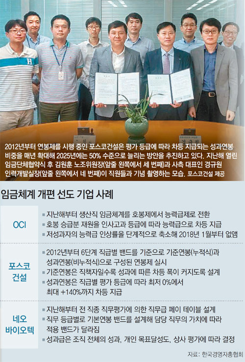 화학에너지기업인 OCI는 2014년 단체교섭 합의에 따라 노사공동 태스크포스(TF)를 구성해 지난해 1월 기능직(생산직) 임금체계를 기존 호봉제에서 능력급제로 전환했다. 과거 근속급과 직능급으로 구분된 임금을 개인 기본급으로 합치고 평가에 따라 능력급을 차등 지급하는 구조로 전환한 것이 핵심이다. OCI는 최하위 고과를 받은 직원의 능력급은 지급하지 않는 대신 그 재원을 상위 고과자에게 배분하는 방식도 추진하고 있다. 박현걸 인사관리팀장은 “저성과자에 대한 능력급 인상분을 점차 줄여 2018년부터는 아예 없애기로 했다”고 말했다.